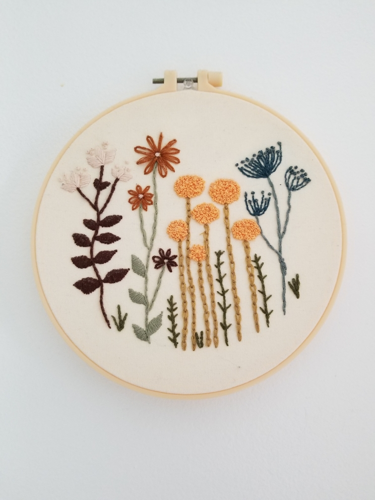 You’ll learn how to do the following stitches: Back stitch, chain stitch, French knot, Lazy Daisy stitch, stem stitch, and satin stitch.