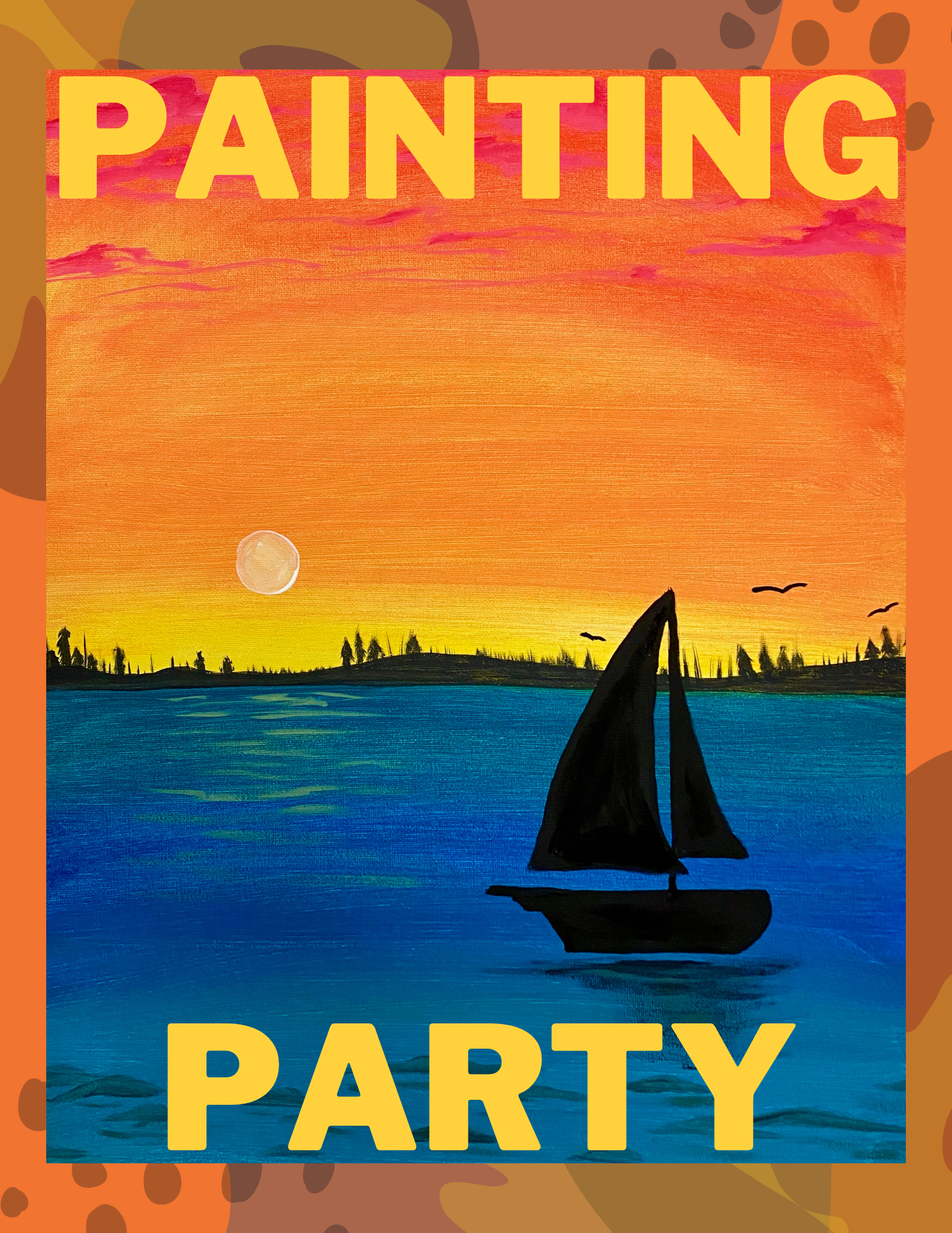 2 hours. Ages 14+. Canvas Acrylic Painting. Join TDBA in painting this lovely sunset painting! This painting is of a colorful sunset with the silhouettes of a sailboat, hills with trees, and soaring birds. No experience needed! Your instructor with guide you step by step until you've created your own work of art! Your […]